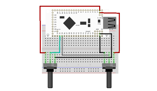 Connect one side of the potentiometer to +3.3V, the opposite side to GND, and the center wiper to the desired analog input pin on the IOIO. The example uses pins 34 and 35, but can be used with other pins that support analog input (pins 31 – 46 on the IOIO). Here is a diagram of the completed circuit (created with Fritzing):
