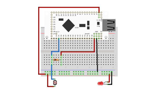 Connect one lead of the photocell to +3.3V and the other to the desired analog input pin (pin 35 below). Also connect that same lead through a 10K resistor to GND creating a voltage divider. Other IOIO pins can be used, as long as they support analog input (pins 31 – 46 on the IOIO). Connect the red leads of the laser to +3.3V and the black lead to GND (or use a battery powered laser). Here is a diagram of the completed circuit (created with Fritzing):