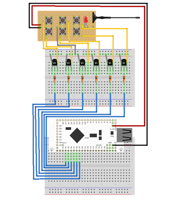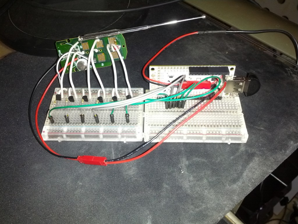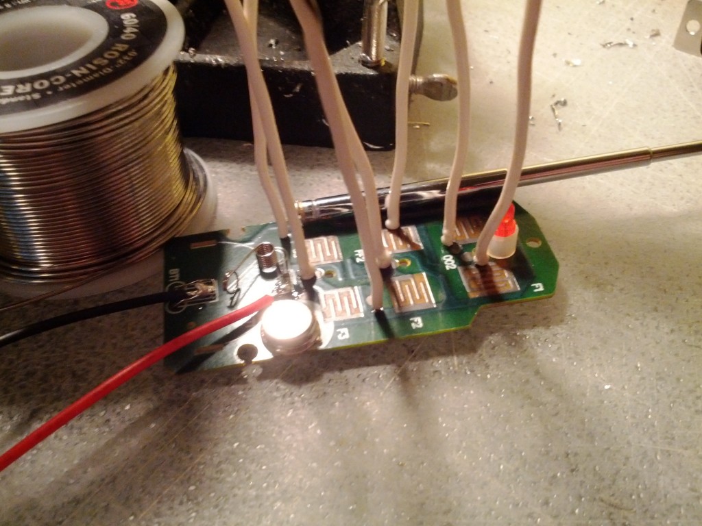 First, remove the outer plastic case from the remote controller. Looking at the board with the button side facing up, locate the seven solderable holes in the circuit board. Six correspond to each button (on/off for each outlet) and the seventh is the common line. Connecting any of the button lines to the common line will activate the connection, turning on or off the respective switch. Solder a wire to each of the switches and the common line: