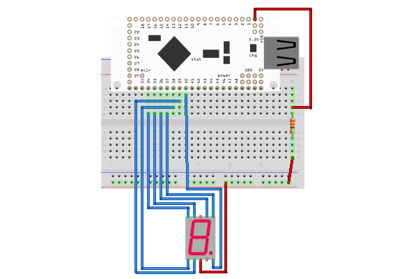 The LED display is common anode with pins 3 and 8 (top center and bottom center) to ground with a current limiting 330 ohm resistor in series. Connect the seven segment pins as shown below to IOIO pins 34 -40. The code can be modified for use with any other IO pins (all IOIO pins are GPIO pins). Here is a diagram of the completed circuit (created with Fritzing):