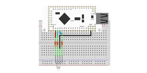 The RGB LED has four leads: the three short ones are anodes that correspond to each of the three colors (red, green, and blue) and the fourth, longer lead is the common cathode. Connect the 330 ohm resistors in series with the anodes of the LED and the common cathode to ground. The example uses pins 34, 35, and 36, but can be used with other pins that support PWM output (pins 3-7, 10-14, 27-32, 34-40, 45-48… marked with the letter ‘p’ on the back of the IOIO). The resistors, in this case, are being used to prevent current overdraw to the LED. Here is a diagram of the completed circuit (created with Fritzing):