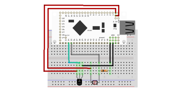 Connect the ground and power leads of the TMP36 to GND and +3.3V respectively, and connect the center signal lead of the TMP36 to the desired input pin (34 below). Then connect one lead of the photocell to +3.3V and the other to the desired analog input pin (pin 35 below). Also connect the same lead through a 10K resistor to ground creating a voltage divider. Other IOIO pins can be used, as long as they support analog input (pins 31 – 46 on the IOIO). Here is a diagram of the completed circuit (created with Fritzing):