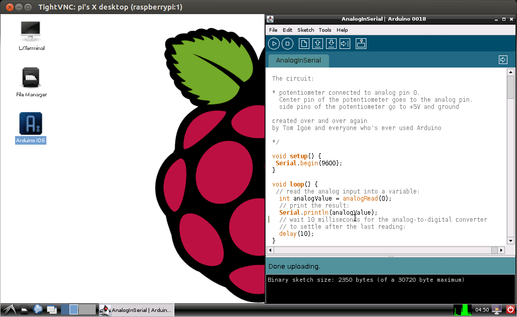 Or, from the LXDE menu, Electronics->Arduino IDE. Note: This is IDE version 0018, and does not seem to recognize boards newer then the Duemilanove. Update: The IDE version in the package manager has been updated to version 1.01 and should work with newer boards like the Uno and Leonardo now as well.