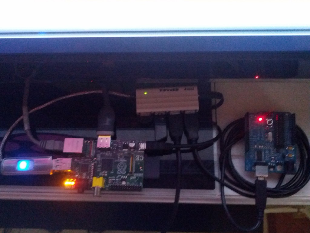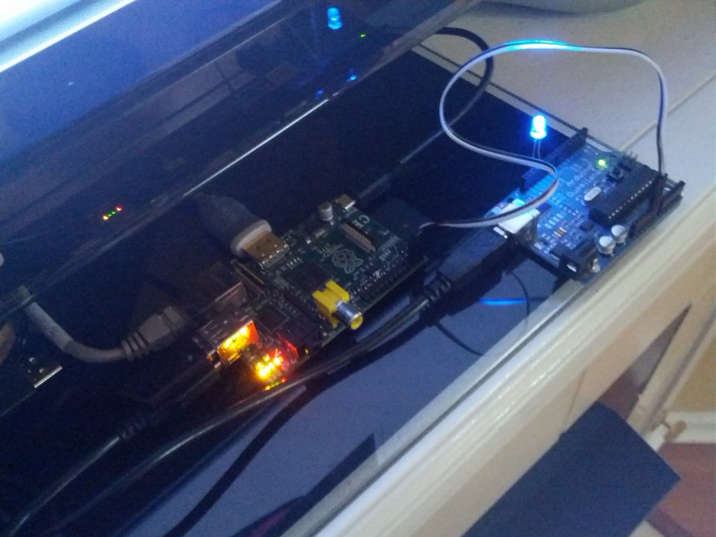 The 1 amp power supply I have connected to my Raspberry Pi was not sufficient to power both the Pi and the Arduino through the USB port, so I connected the Arduino through a powered external USB hub. This may not be necessary with a larger power supply connected to the Pi. Update: A larger power supply will not overcome this limitation; the micro USB port on the Raspberry Pi is fused with 1100mA. –Thanks cavebeat
