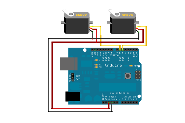 Connect the red, power lines of the servos to +5v, the black ground lines to GND, and the yellow signal lines to the desired output pins, 5 and 6 in the example (others can be used, but must be PWM capable