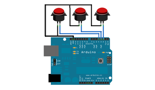 The following two examples both use three buttons connected to the Arduino. The code can easily be changed to make the buttons perform other actions, by consulting the mapping tables in the USB HID documentation. Here is a diagram of the circuit, (created with Fritzing):